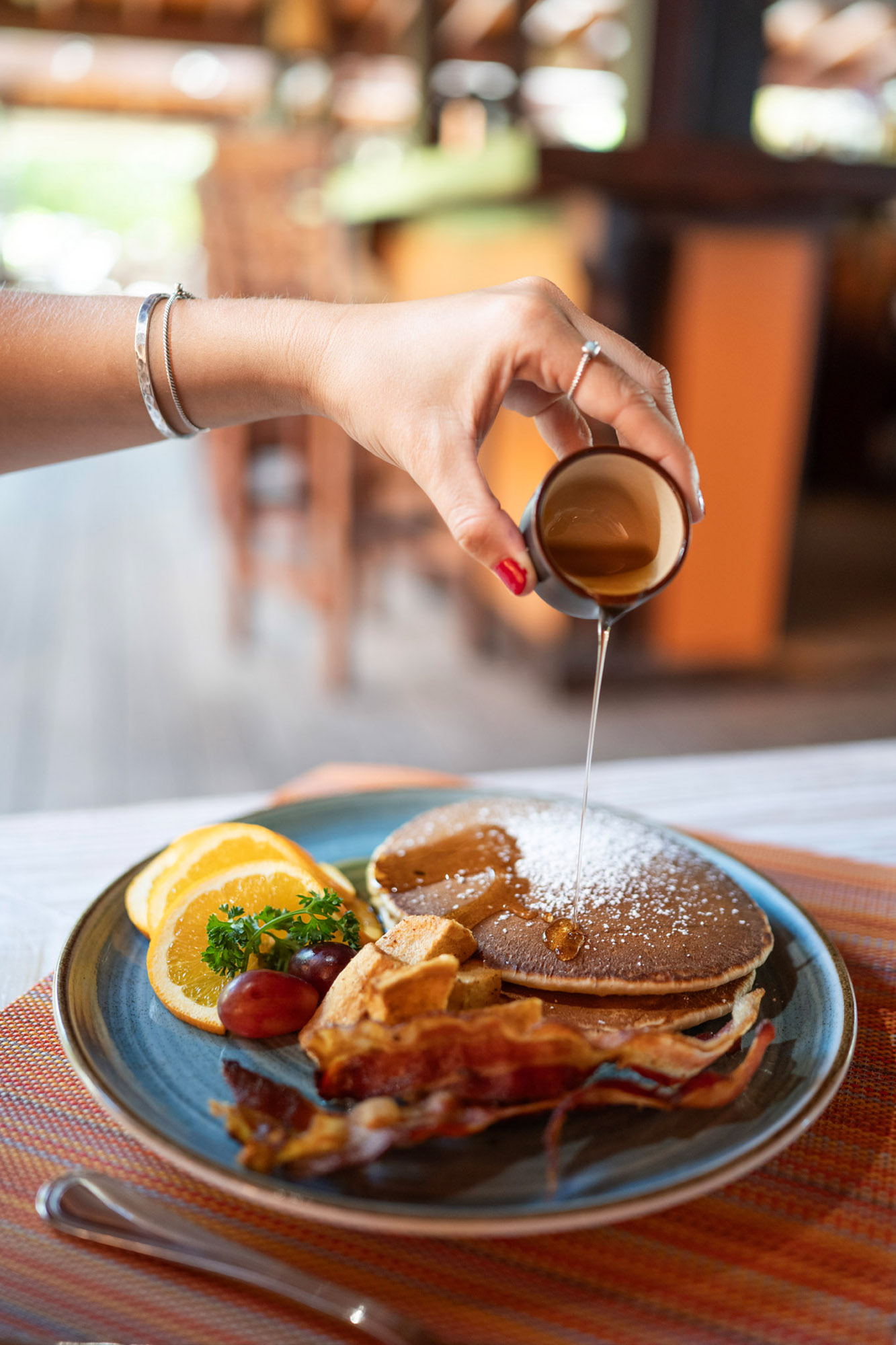 $192 of our homemade pancakes served with maple syrup and a side of bacon Add chocolate chips 2, coconut flakes 2, fresh blueberries 3