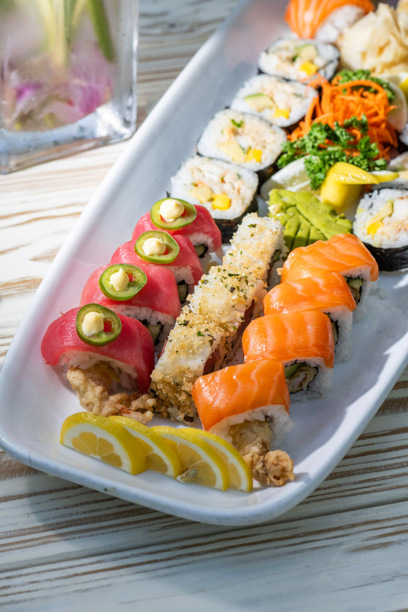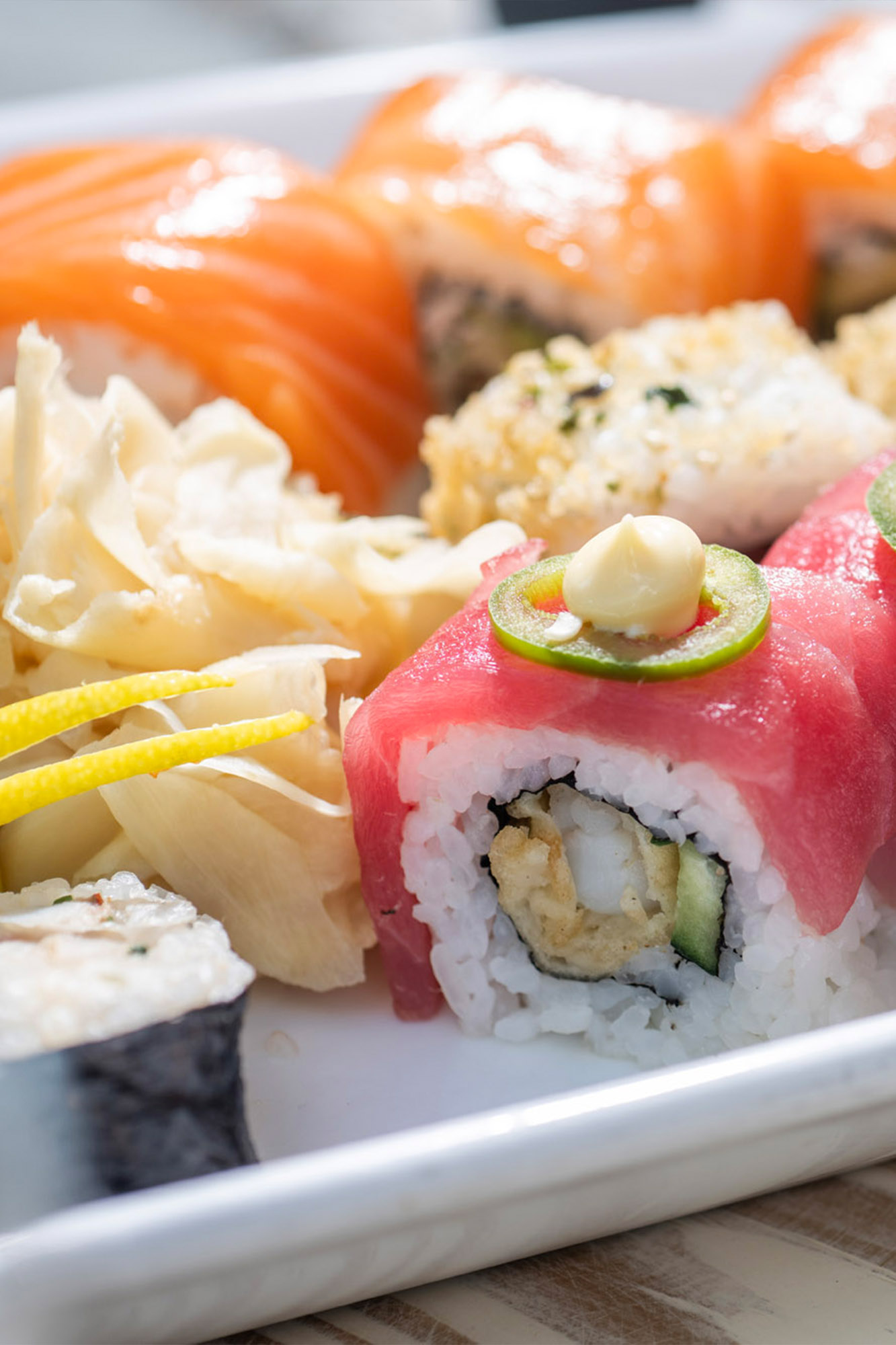 Filled with shrimp tempura and avocado, wrapped in tuna, jalapenos, mayonnaise and eel sauce