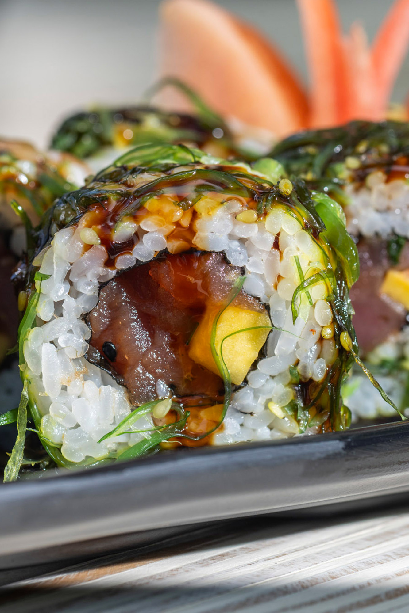 Filled with spicy tuna and mango, wrapped in wakame and covered with eel sauce